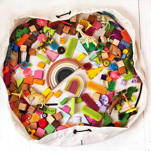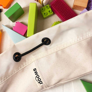 This is the ORIGINAL Swoop Bag that put us on the map in 2011. However, we have changed the design to add the 6" edge piece to really contain all those small pieces. The quality and durability of our bags is our number one priority.When opened wide, this toy bag converts to a circular playmat that 4-5 kids can comfortably play around, not on top of. Swoop Bags are a cleanup dream and toy storage solution for parents, caregivers or anyone that is facing the challenge of picking up all those little pieces. Just “Swoop up” the bag with the drawstring cords, tie cords to secure closed (like tying your shoes) and stow in a bin, hang on a bed post, hook or door knob or just leave on the floor. You can watch our how-to VIDEO to see just how easy cleanup is.