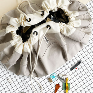 When done playing, just “Swoop up” the bag with the drawstring cords, tie cords to secure closed (like you are tying your shoes) and stow in a bin, hang on a bed post, hook or door knob or just leave on the floor. You can watch our how-to VIDEO to see just how easy cleanup is.