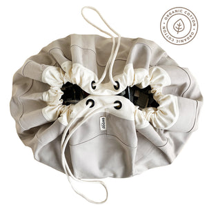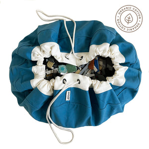 When done playing, just “Swoop up” the bag with the drawstring cords, tie cords to secure closed (like you are tying your shoes) and stow in a bin, hang on a bed post, hook or door knob or just leave on the floor. You can watch our how-to VIDEO to see just how easy cleanup is.